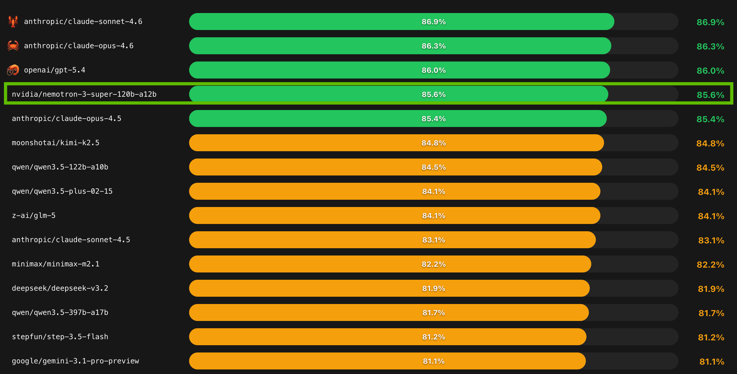 NVIDIA протестировала Nemotron 3 Super на PinchBench, наборе тестов, используемом для оценки рабочих нагрузок агентов, и модель показала результат 85,6% по всему набору тестов, превзойдя Opus 4.5, Kimi 2.5 и GPT-OSS 120b. Для потребителей, которые запускают ресурсоемкие задачи через OpenClaw, Nemotron 3 Super открывает совершенно новый класс производительности, с вычислительными требованиями, которые могут быть удовлетворены всего одной видеокартой.