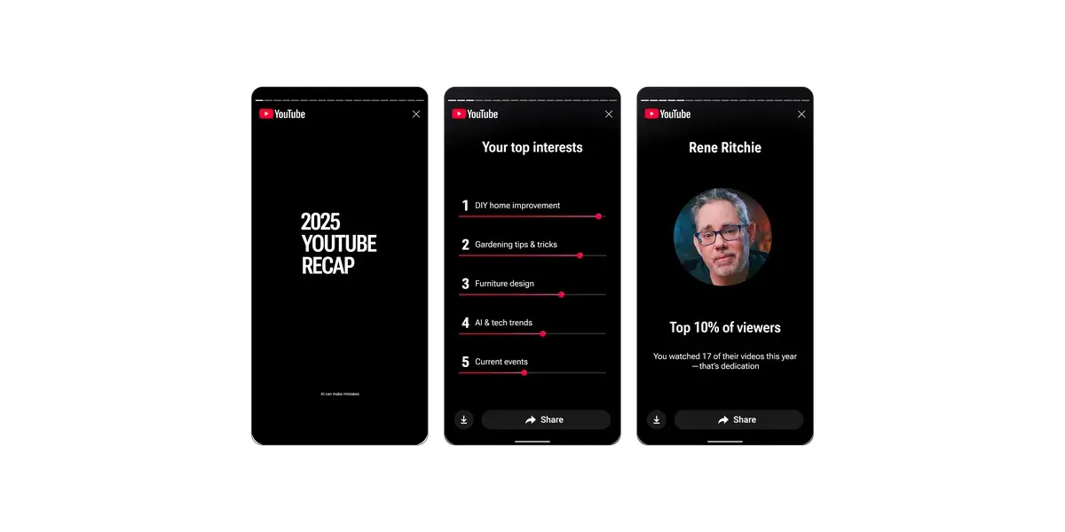 YouTube запускает собственные «Итоги года» (Recap), которые собирают вашу активность последний год в 12 картинок. Они показывают ваши любимые каналы, темы и даже то, как менялись предпочтения со временем.