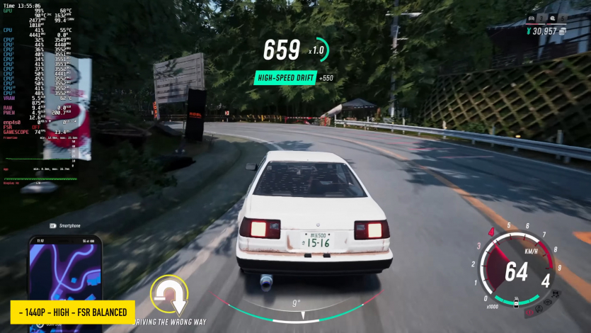 В играх система показала себя очень неплохо — пожалуй, лучше, чем многие представляют. Elden Ring работает в разрешении 1440p с максимальными настройками, с заблокированными 60 FPS. Spider-Man 2 в среднем разрешении 1440p со сбалансированной FSR показывает около 70-75 FPS, а переход на высокие настройки FSR на качество плюс генерация кадров поднимает частоту кадров выше 100 FPS. Cyberpunk 2077 в высоком разрешении 1440p поддерживает рейтинг выше 60 FPS без FSR, тогда как The Witcher 3 на ультра разрешении 1440p с FSR в режиме качество также превышает 60 FPS.