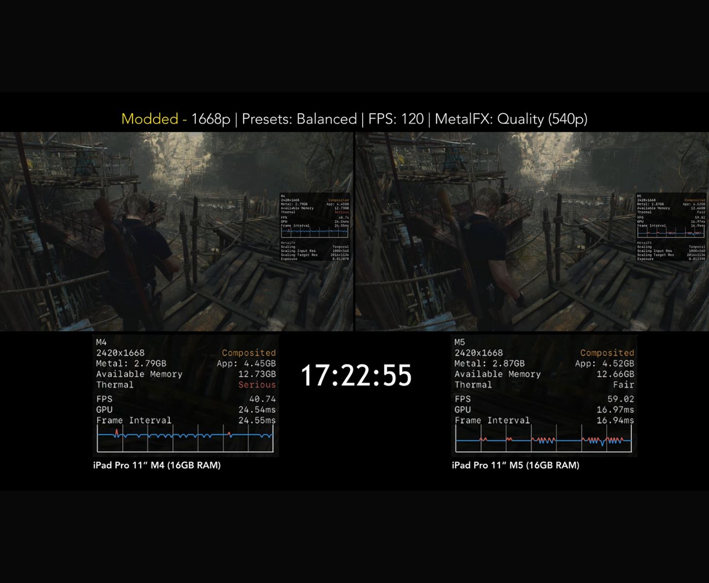После редактирования конфигурационных файлов блогеру удалось разблокировать частоту 120 FPS, снизить разрешение и выставить режим MetalFX Quality. В таком режиме iPad Pro M5 держал частоту 50-60 FPS, тогда как устройство с M4 падал до середины 40 FPS, а M1 едва достигал 20 FPS.