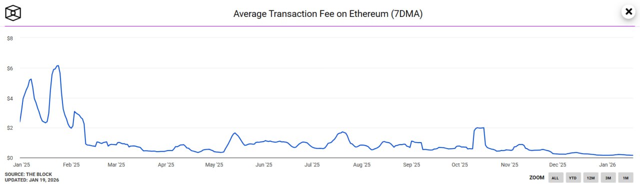 Параллельно упали комиссии: средняя плата за газ в расчете 7DMA опустилась до $0,15 по состоянию на 17 января — это минимум за все время наблюдений. Лимит газа на блок был увеличен с 45 млн до 60 млн, что повысило пропускную способность сети и снизило комиссии для пользователей, включая транзакции на Layer 2. Доля транзакций стейблкоинов в общем объеме сети оценивается примерно в 35-40 %.