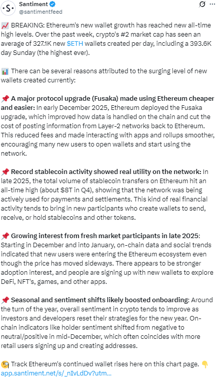 За несколько дней до рекорда по транзакциям сеть обновила еще один максимум. 14 января Ethereum зафиксировал рекордный приток новых адресов. За данные Santiment, среднесуточный рост количества кошельков в недельном разрезе достиг 327 100. Абсолютный пик пришелся на 11 января, когда за сутки было создано 393 600 новых адресов — больше всего за всю историю сети. Напомним, что в конце прошлого года Ethereum также установил исторический рекорд скорости (24 тыс. транзакций в секунду).