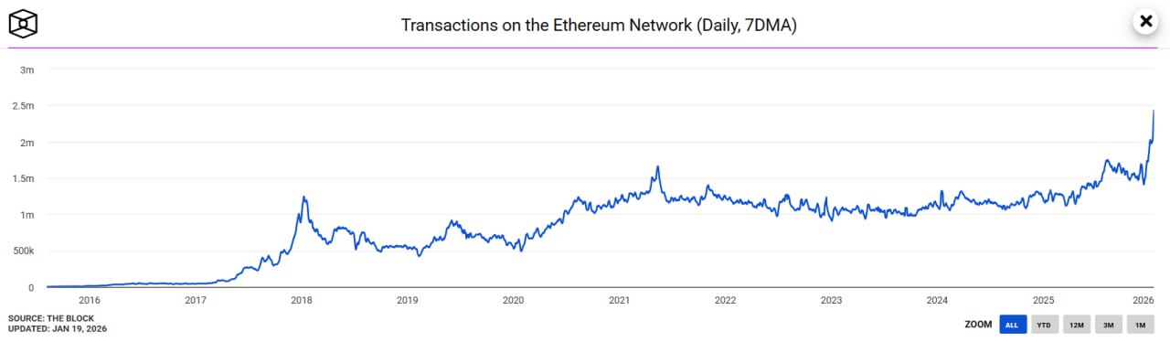 17 января семидневное скользящее среднее количества транзакций в сети Ethereum достигло 2,43 млн, говорит The Block. Это самый высокий уровень за всю историю блокчейна. Предыдущий максимум держался с мая 2021 года. Текущий рост началось в середине декабря 2025 года — сразу после запуска обновления Fusaka в мейннете. Хардфорк расширил пространство blobs и ввел PeerDAS (Peer Data Availability Sampling), что снизило нагрузку на сеть.