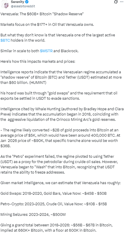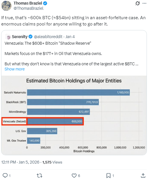 В самой соцсети X тему активно подхватили несколько аккаунтов. Пользователь aleabitoreddit написал о потенциальном масштаб скрытых BTC-запасов Венесуэлы. Аккаунт CHAINISLE_EN распространил эти утверждения в Х, акцентируя внимание на диапазоне 600-660 тыс. BTC. Аналитик Thomas Braziel отдельно отметил, что в случае подтверждения таких объемов речь идет об одном из крупнейших необъявленных биткоин-резервов в мире.