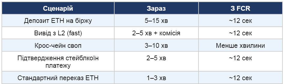З FCR логіка змінюється радикально. Біржа отримує жорстку гарантію вже через 12 секунд і може зарахувати депозит негайно. За оцінками розробників, час обробки депозитів скорочується на 80-98% залежно від поточних налаштувань конкретної платформи.