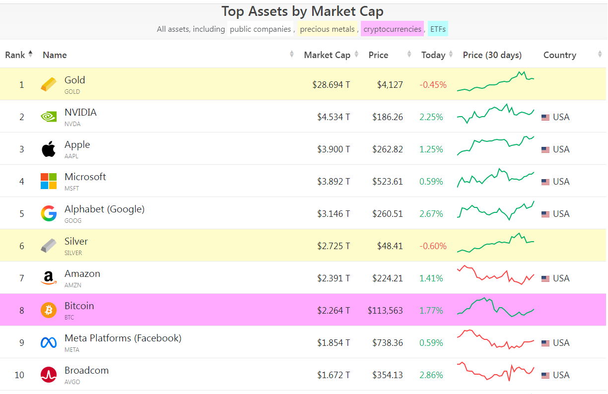 Золото отримало сильний структурний попит з боку центральних банків, які у 2023 і 2024 роках купували понад 1 044 т золота на рік. Це найвищі темпи закупівель за понад 30 років, і вони свідчать не про спекуляцію, а про перегляд резервної архітектури держав. У 2025 році золото досягло рекордної капіталізації на ринку: вона перевищила $30 трлн – вперше в історії. Навіть після останніх днів, коли метал різко впав у ціні і його ринок втратив близько $2,5 трлн, золото залишилось світовим лідером за капіталізацією.