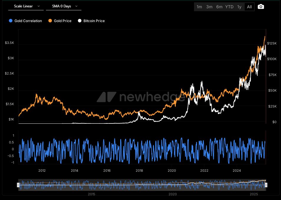 За останнє десятиліття біткоїн переважав золото у 9 з 12 років; але у роки стресу (2018, 2022) якраз золото виконувало роль захисного активу (−1% у 2018, +0,4% у 2022). У 2025-му метал виривався вперед (ATH – приблизно $4 380), тоді як біткоїн спершу пробивав $100k, коригувався нижче $80k і відновлювався.