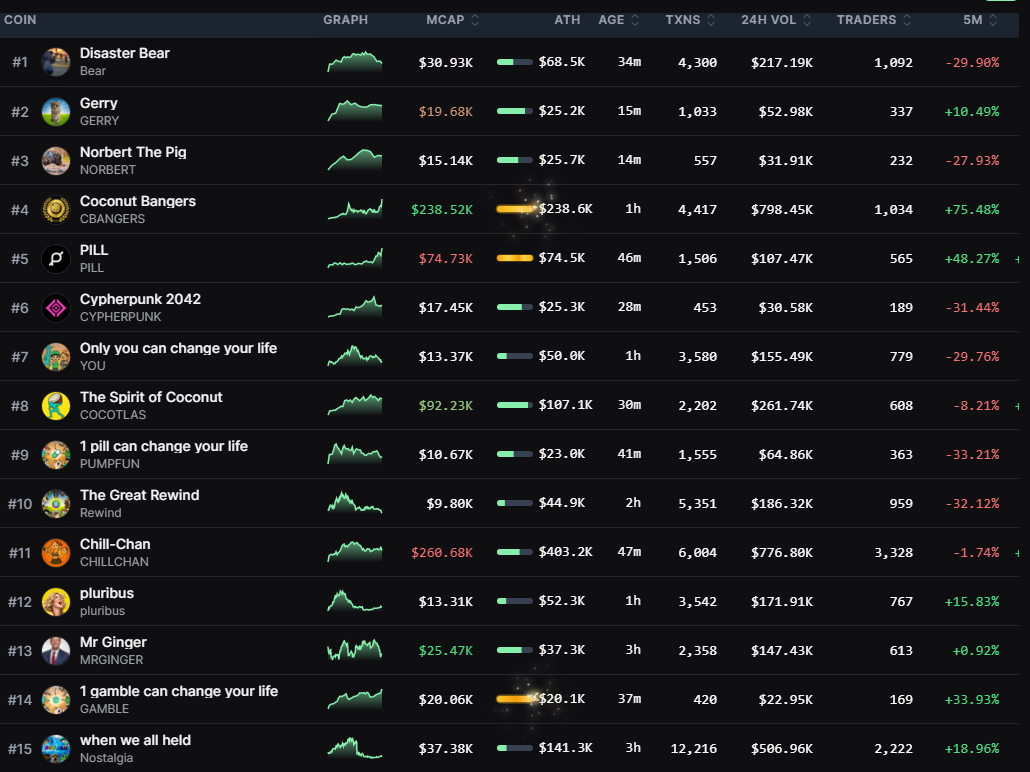 У 2024 році головними темами стали NFT, “жаби” та пародійні токени. На початку 2025 року поширилися меми, пов’язані зі штучним інтелектом, пізніше — релігійно-технологічні теми та політичні проєкти ($TRUMPISBACK, $BIDENRUG). Навесні поширилися мета-меми ($PUMPISSCAM, $ONLYDEVSGETRICH), а ближче до літа — іронічні ($IMSTILLHERE, $LOSTITALL). До літа також з’явилися токени із самоіронічними назвами, спрямовані на криптотрейдерів. Різке зростання кількості випусків спричинило перенасичення. Частина токенів не змогла набрати ліквідність. Активність перемістилася до ботів, які автоматично створюють і скуповують монети. Це дещо знизило органічну участь користувачів.