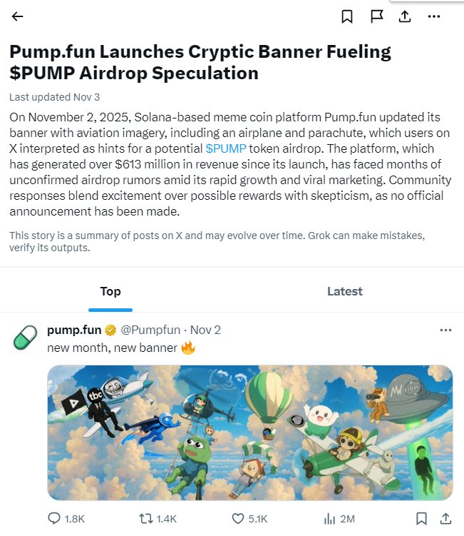Додатковим чинником уваги спільноти став анонсований ще в липні аірдроп токена PUMP, який досі не відбувся. У жовтні Pump.fun оновила банер на сторінці в X, де з’явився парашут із токенами PUMP і SOL. Оновлення з подібною картинкою відбулося і на початку листопада. Це спричинило сплеск спекуляцій: на prediction-маркеті Kalshi ймовірність аірдропу до кінця року сягала 91%, але згодом різко знизилася.