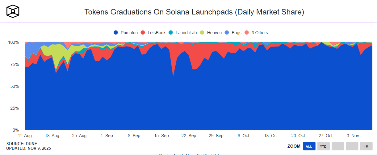 На піку розвитку користувачі створювали понад 70 тис. токенів на день. Восени показник впав до 10-15 тис. Основна причина — конкуренція з боку майданчика LetsBonk, який за кількістю запусків перевищив Pump.fun удвічі. Частка успішних випусків знизилася з 1,6% у листопаді 2024 року до 0,6% у травні 2025-го. Ринок став більш автоматизованим: більшість угод здійснюють боти, що скуповують токени для потрапляння у верхні позиції списків. За даними Dune, у жовтні LetsBonk зареєстрував 18 093 нових токенів, тоді як у Pump.fun — 9535. Втім, Алон Коен, засновник Pump.fun, вважає, що на ринку мемкоїнів 1% успішних токенів — це вже успіх.