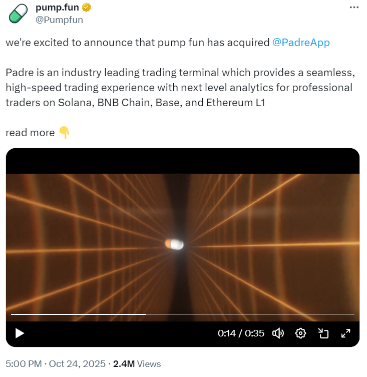 Наприкінці жовтня Pump.fun оголосила про купівлю мультичейнового трейдингового термінала Padre. Сума угоди не розголошується. Сервіс продовжує роботу в мережах Solana, BNB Chain, Ethereum і Base. Токен PADRE більше не використовується. Інтеграція функцій Padre покликана покращити інтерфейс і швидкість операцій на Pump.fun.