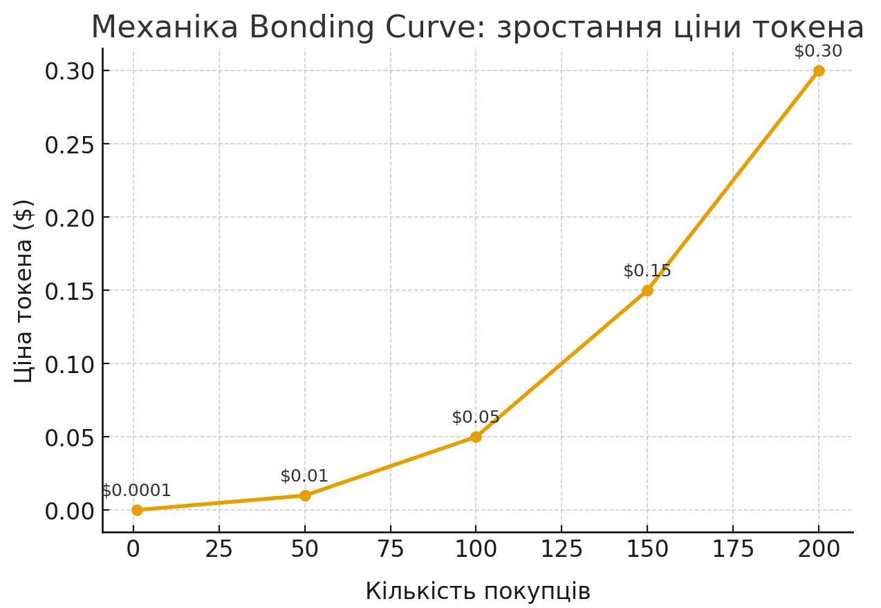 Pump.fun використовує механізм зв’язкової кривої (bonding curve). Кожен новий токен купується за трохи вищою ціною, ніж попередній. Це створює ефект швидкого зростання й стимулює ранніх інвесторів. При досягненні капіталізації близько $69 000 токен переходить у статус “випущеного” і автоматично листиться на децентралізованій біржі Raydium. Під час цього 206,9 млн токенів і 85 SOL спрямовуються до пулу ліквідності, що забезпечує безперервну торгівлю.