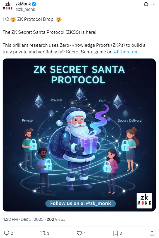 Протокол ZK Secret Santa (ZKSS) створив керівник напряму Solidity у Distributed Lab та автор проєкту Circom Witchcraft Артем Чистяков. Про роботу він повідомив на форумі Ethereum Research, а початковий технічний опис опублікував у науковій статті на arXiv. За словами автора, метою було показати, як за допомогою криптографії можна реалізувати “справжнього Таємного Санту” в ончейні — так, щоб ніхто не знав, хто кому дарує подарунок, і водночас щоб правила гри неможливо було порушити.