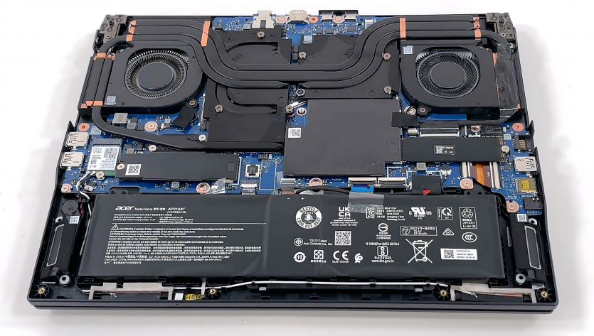 Система охолодження в Acer Predator Helios Neo 16 AI побудована за активною схемою з двома потужними вентиляторами AeroBlade (металеві лопаті) і кількома тепловими трубками, що відводять тепло від CPU і GPU до радіаторів по периметру корпусу. Усередині використовується рідкий метал на центральному процесорі для покращення теплопередачі, що за ідеальних умов допомагає знімати більше тепла, ніж звичайна термопаста.