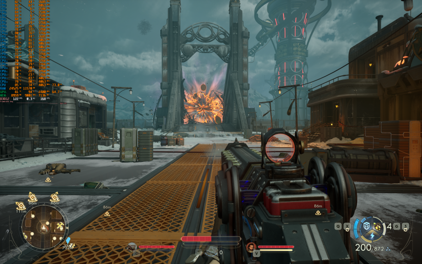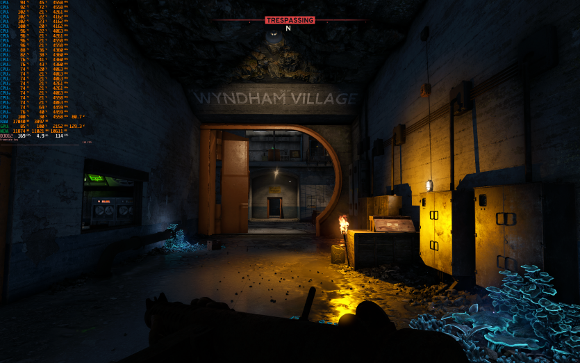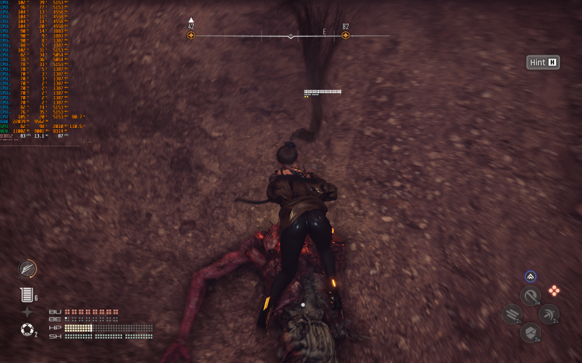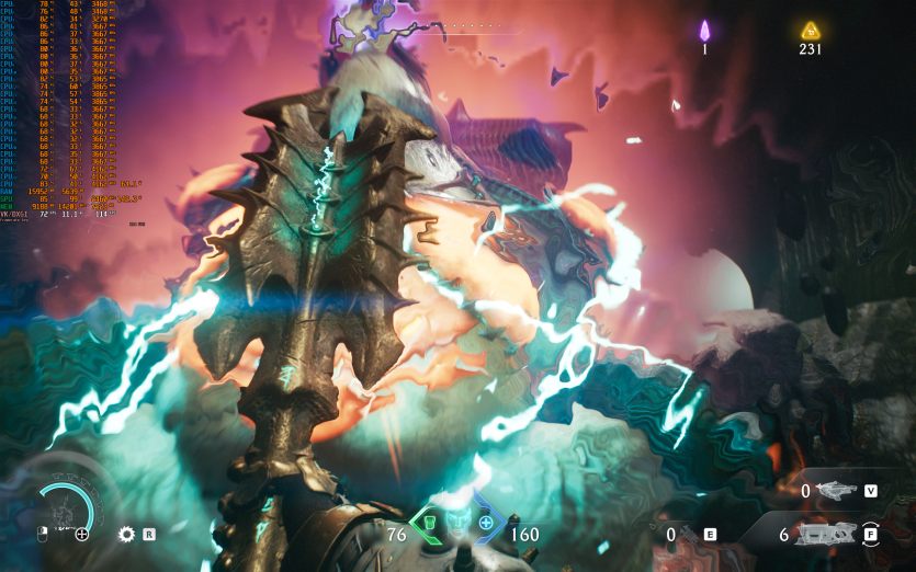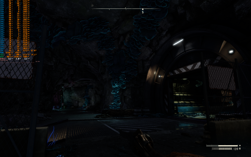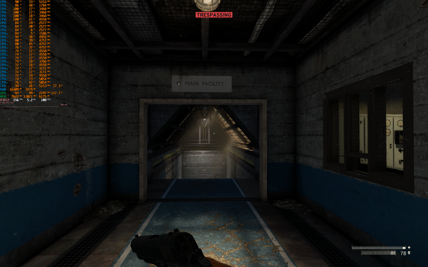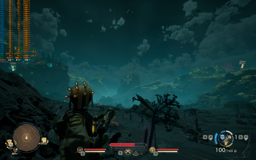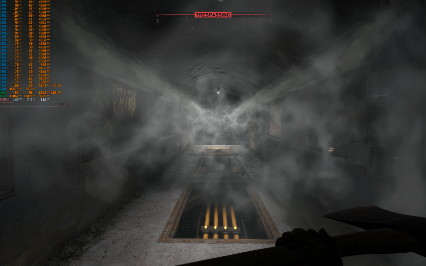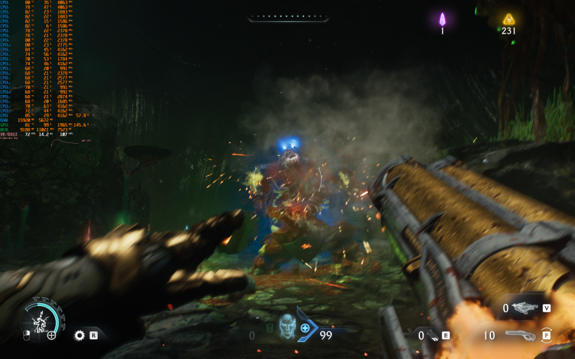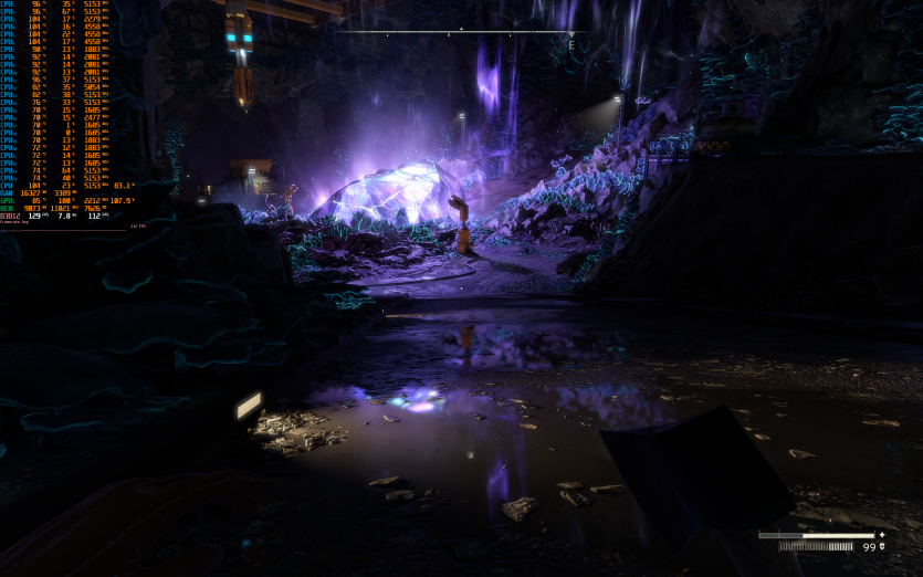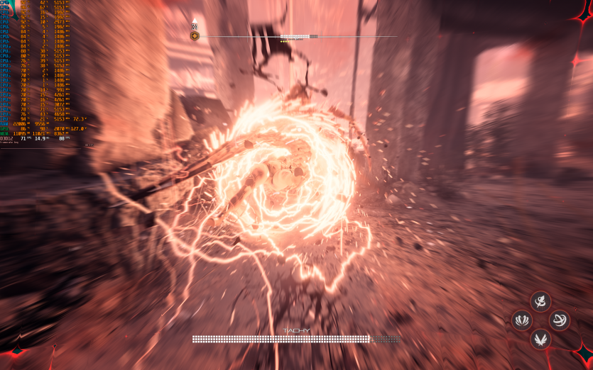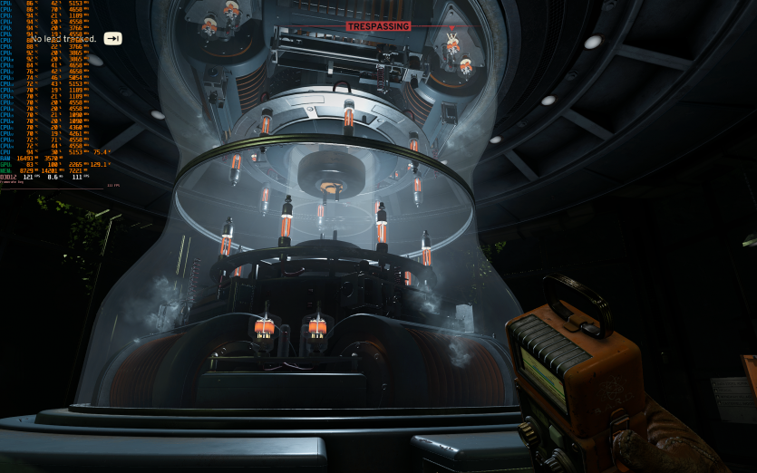 Atomfall у режимі Ultra з MSAA 8X без FG тримає 128 FPS. Навантаження рівномірно розподіляється між процесором і відеокартою, але температура GPU стабільно залишається в зоні 84–86 °C, що вже близько до верхньої межі комфорту.