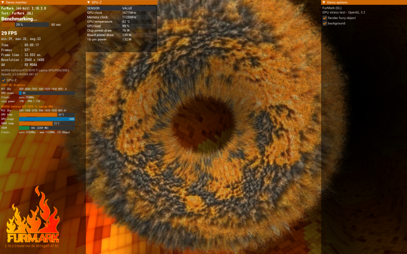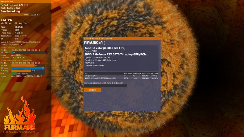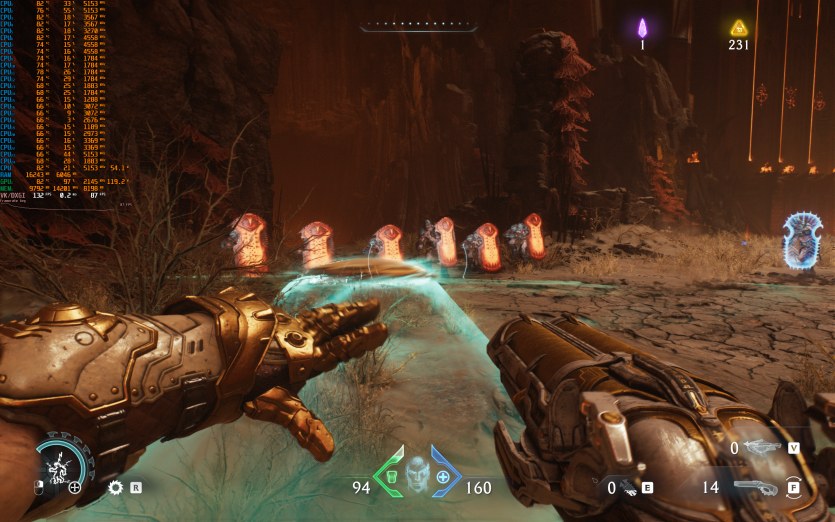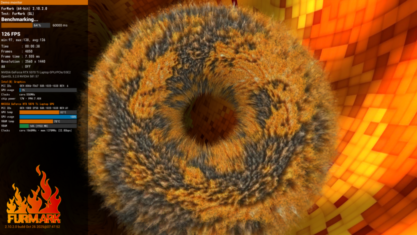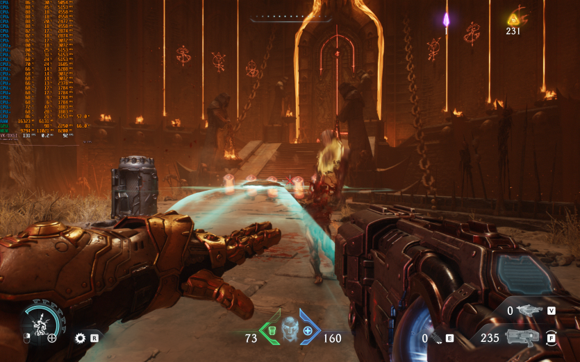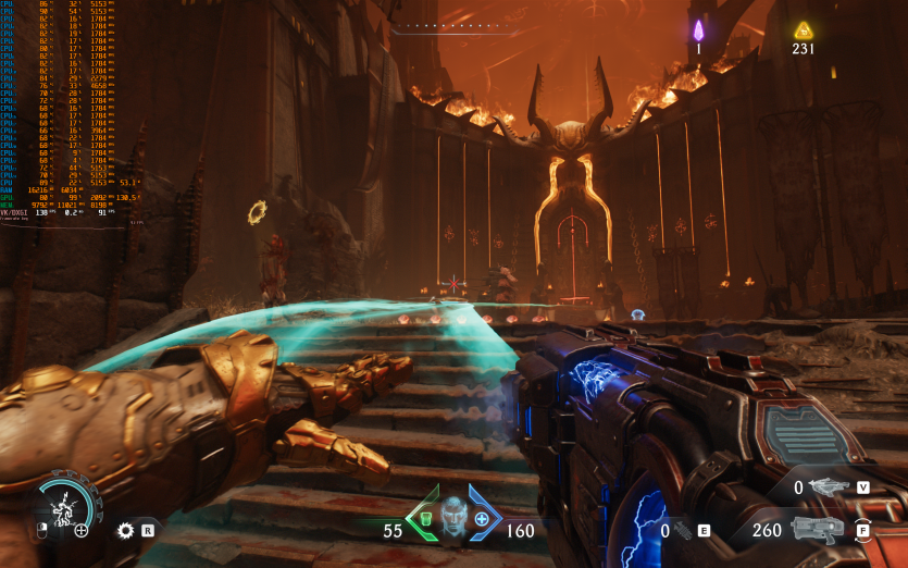 Doom: The Dark Ages — з налаштуваннями Ultra Nightmare з RT і Path Tracing, у поєднанні з DLSS та Multi Frame Generation, ноутбук видає 71 FPS. А от вимкнувши Path Tracing, можемо залишити той же пресет та перейти на DLSS Quality і отримати вже 120+ к/с.