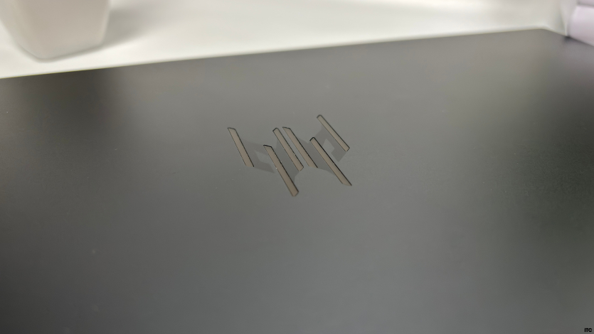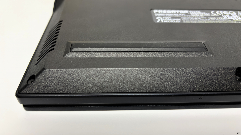 Матеріали корпусу Acer Predator Helios Neo 16 AI комбіновані: металева кришка дисплея та пластик. Метал на кришці додає жорсткості. Але він дуже швидко збирає відбитки пальців, що особливо помітно на темному покритті. Пластик корпусу матовий, практичний, але без візуальних або тактильних ознак преміального сегмента. Жорсткість конструкції середня. Кришка дисплея прогинається при натисканні, а область клавіатури під сильним тиском може незначно деформуватися.