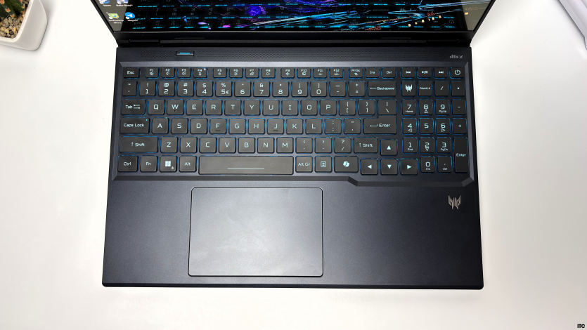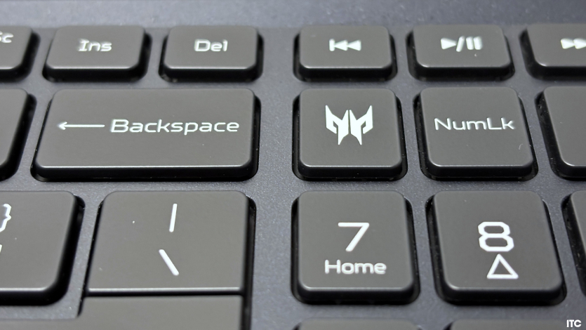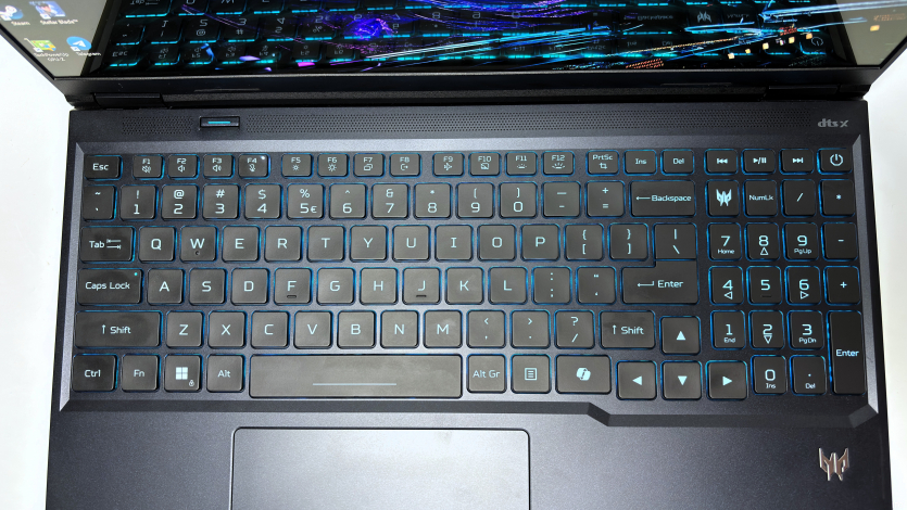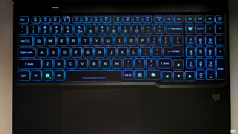 Клавіатурний блок Acer Predator Helios Neo 16 AI повнорозмірний, із цифровою секцією. Для роботи з таблицями це зручно, але під час активного набору тексту таке компонування може вимагати звикання, особливо якщо користувач переходить із ноутбуків без NumPad. Самі клавіші мають середній хід близько 1,6–1,8 мм, натискання чітке, з відчутною точкою спрацювання. Друкувати комфортно, хоча до механічних або преміальних клавіатур рівня ультрабуків тут далеко.