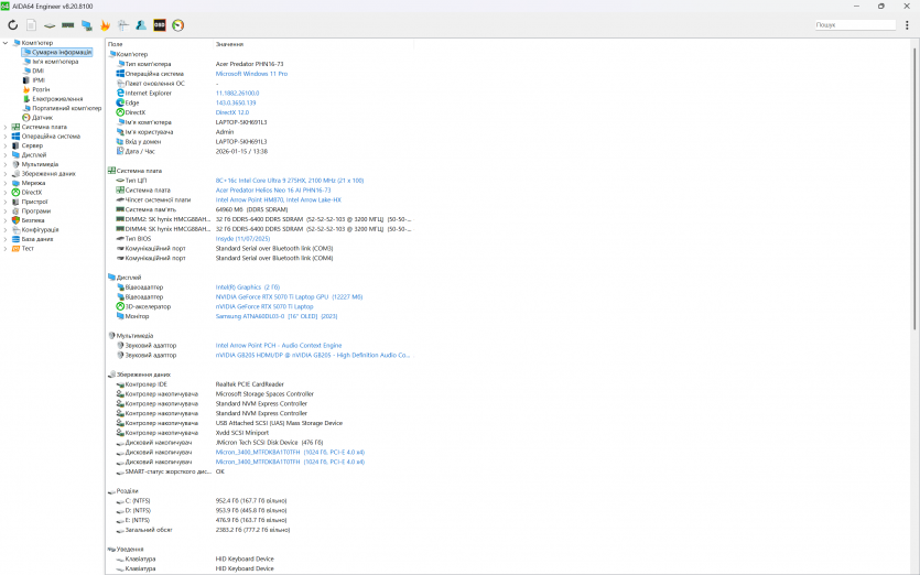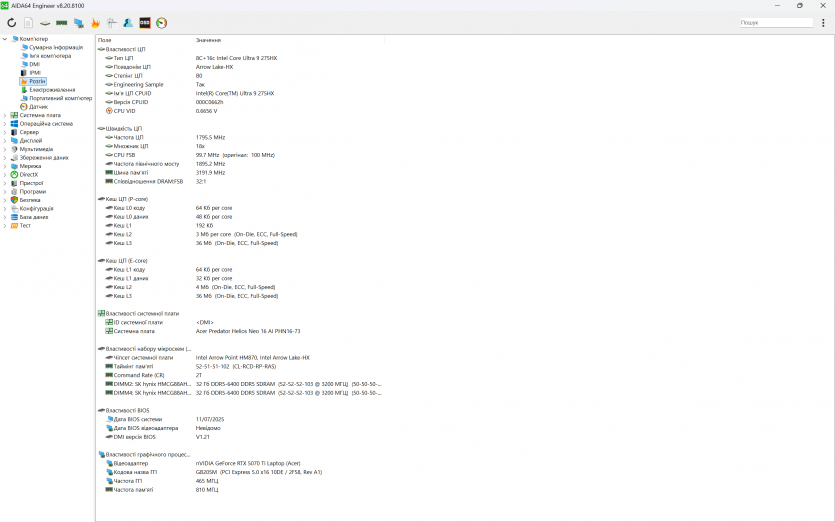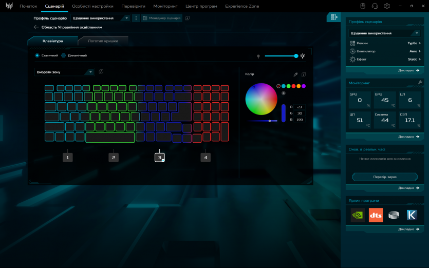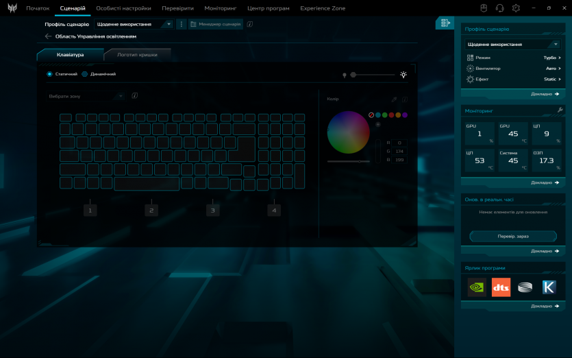 Acer Predator Helios Neo 16 AI постачається з ліцензованою Windows 11 Pro. Основний інструмент керування — PredatorSense. Це фірмова утиліта Acer для контролю низки апаратних параметрів. Вона дозволяє перемикати режими продуктивності, налаштовувати RGB‑підсвітку клавіатури та моніторити температури, завантаження та оберти вентиляторів.