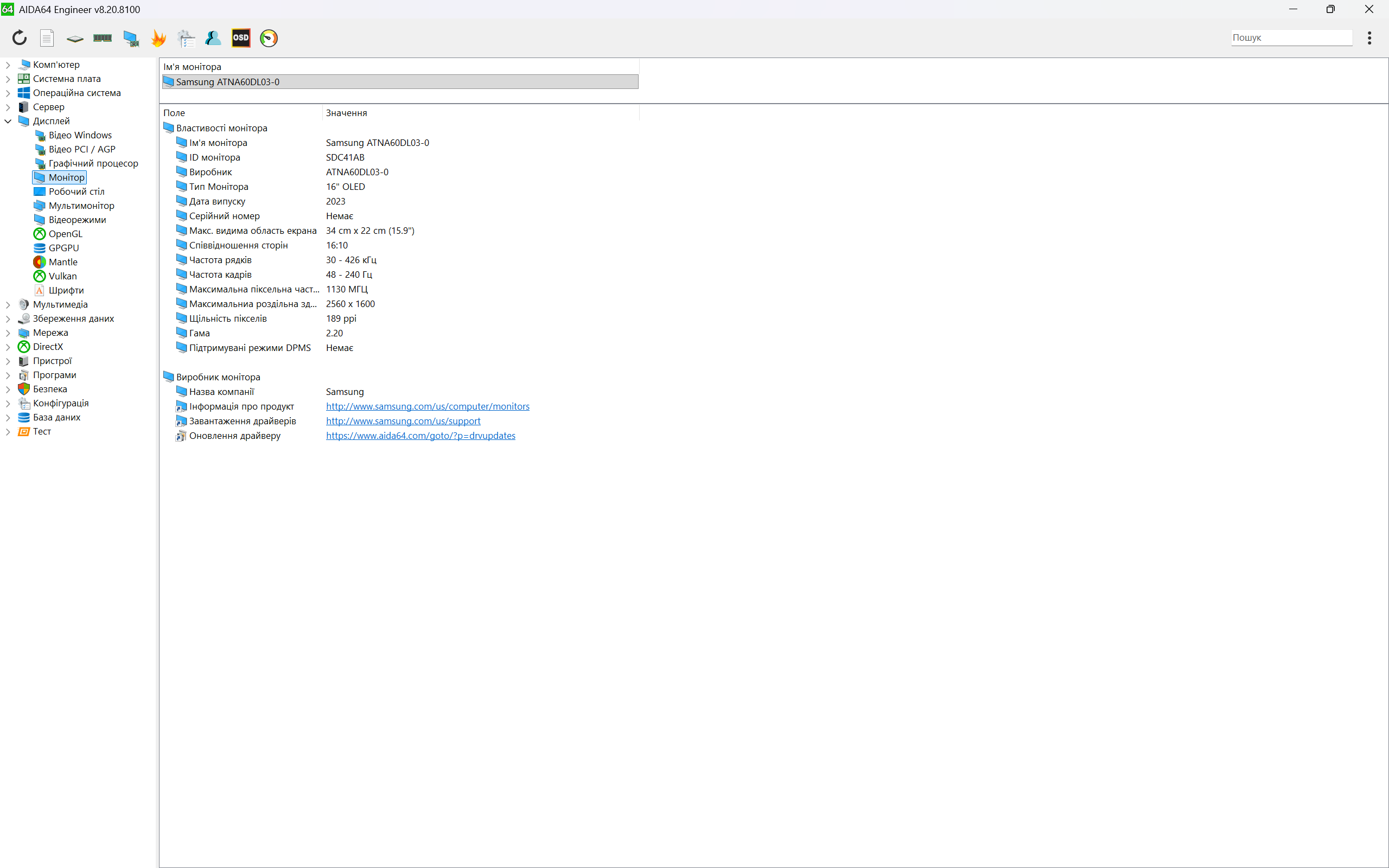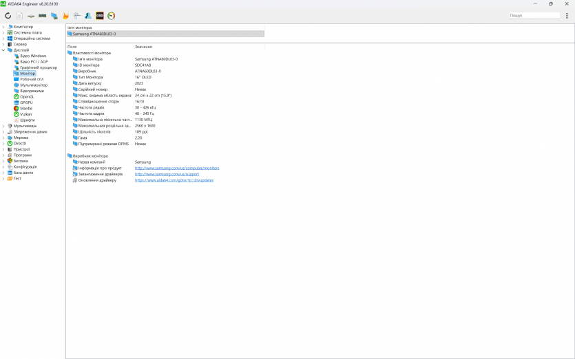 Acer Predator Helios Neo 16 AI оснащується 16-дюймовою OLED-матрицею з роздільною здатністю 2560×1600 пікселів та співвідношенням сторін 16:10. Щільність пікселів становить приблизно 189 ppi, що повністю виключає помітну зернистість у стандартних сценаріях використання.