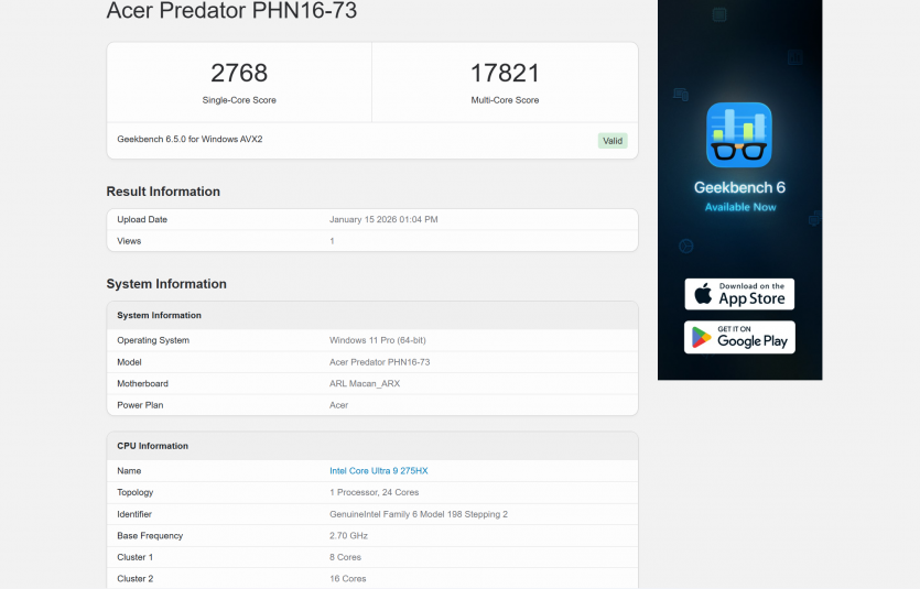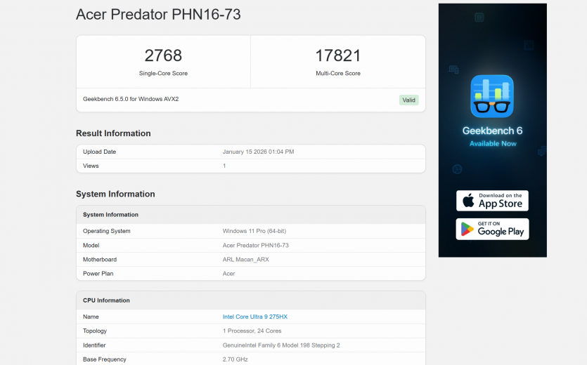 Acer Predator Helios Neo 16 AI демонструє високий рівень продуктивності у робочих сценаріях при підключенні до мережі. У багатозадачності, браузері та офісних програмах система показує результати, які відповідають сучасним ігровим ноутбукам високого класу: PCMark 10 Extended — 12 816 балів, що дозволяє одночасно працювати з документами, веб-додатками та легкими мультимедіа-завданнями без видимих затримок.