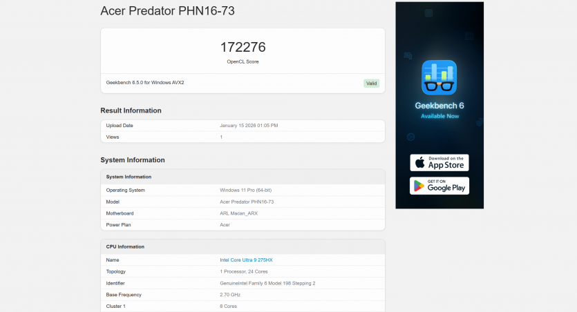 У браузерних тестах різниця між живленням від мережі та від батареї помітна. Speedometer 3.1 показав 43,62 на БЖ та 27,4 на АКБ, а Google Octane 2.0 Plus Multi Core — 1 131 725 на БЖ і 1 064 108 на АКБ.