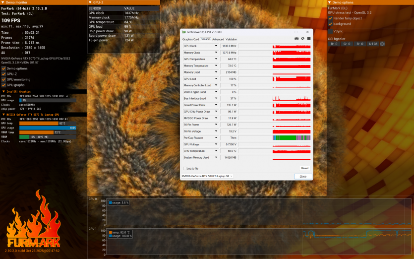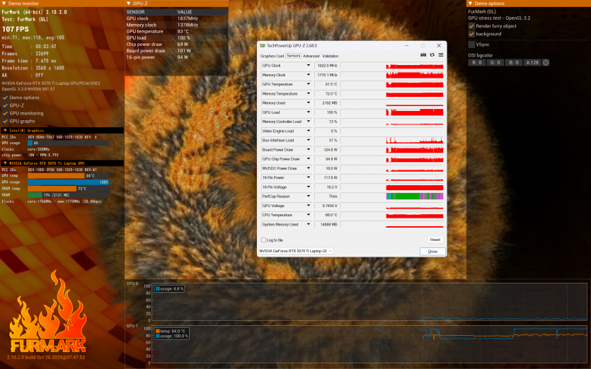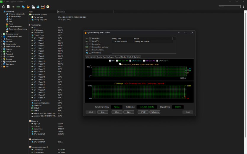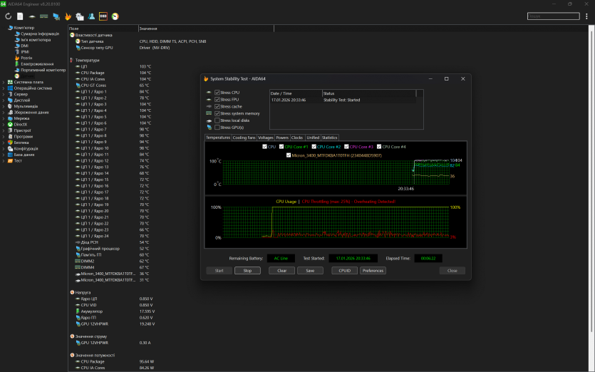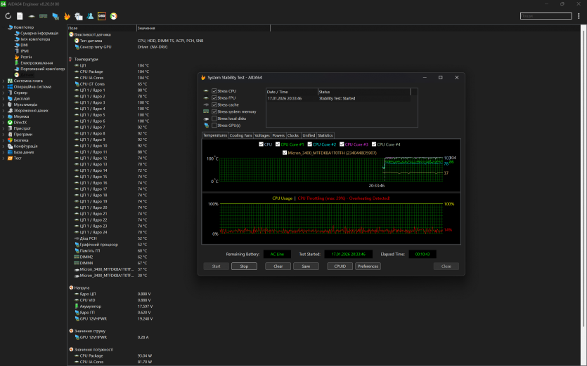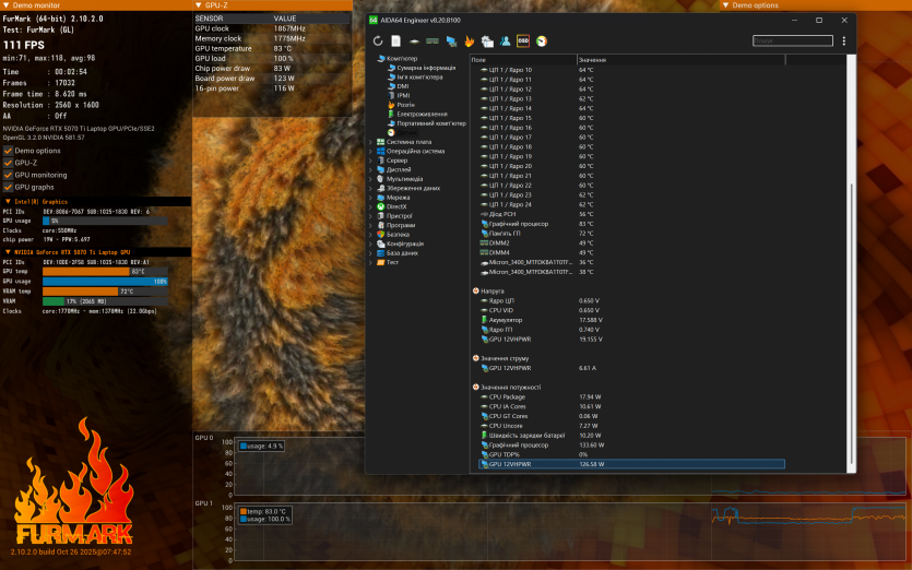 Водночас варто одразу зафіксувати: під тривалим ігровим навантаженням температури далекі від ідеальних: процесор у піках короткочасно доходить до 104–105 °C, а відеокарта тримається в середньому на рівні 84–86 °C.