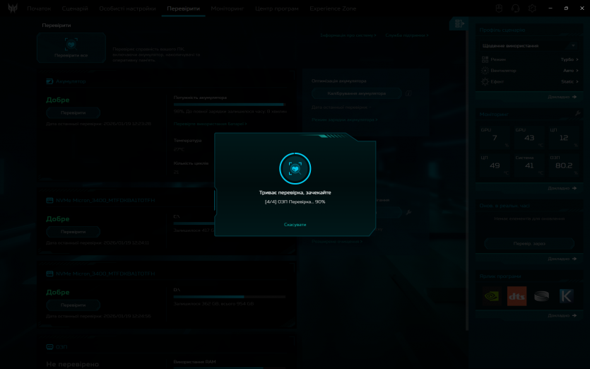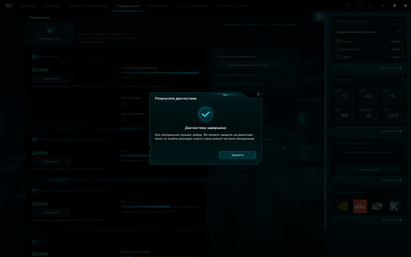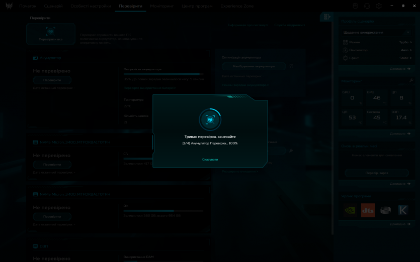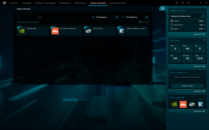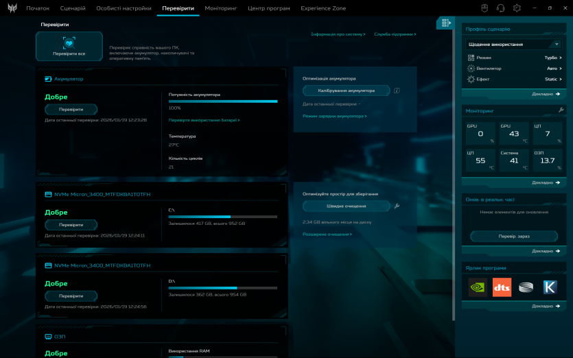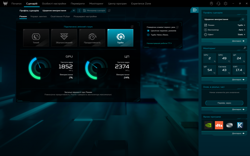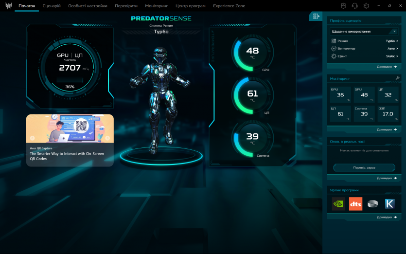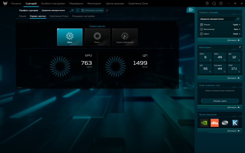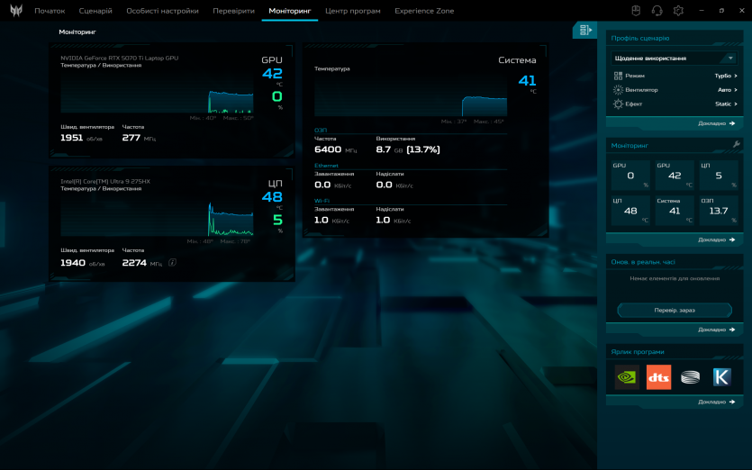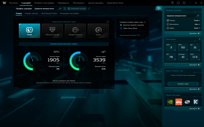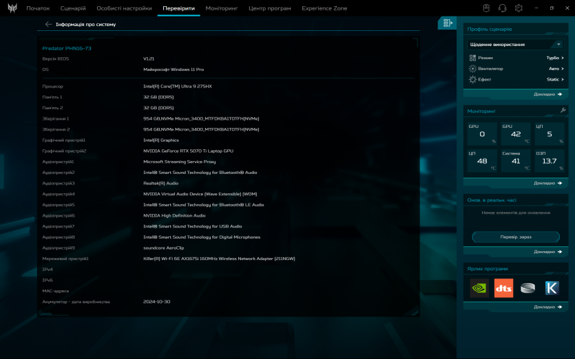 PredatorSense працює як і задумано: швидко перемикає режими продуктивності та вентиляції, показує температуру й оберти вентиляторів. Плюс, можна провести імпровізований техогляд компонентів ноутбука.