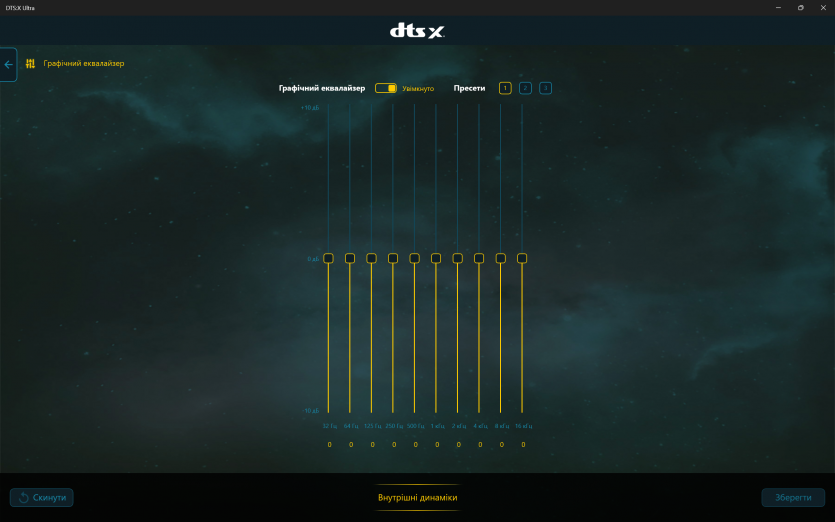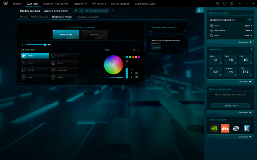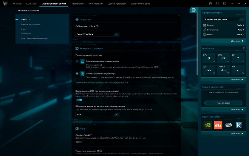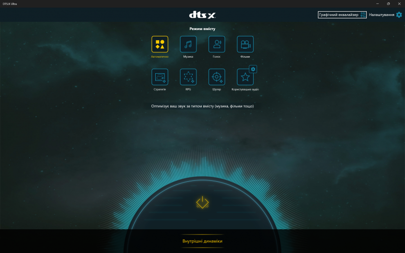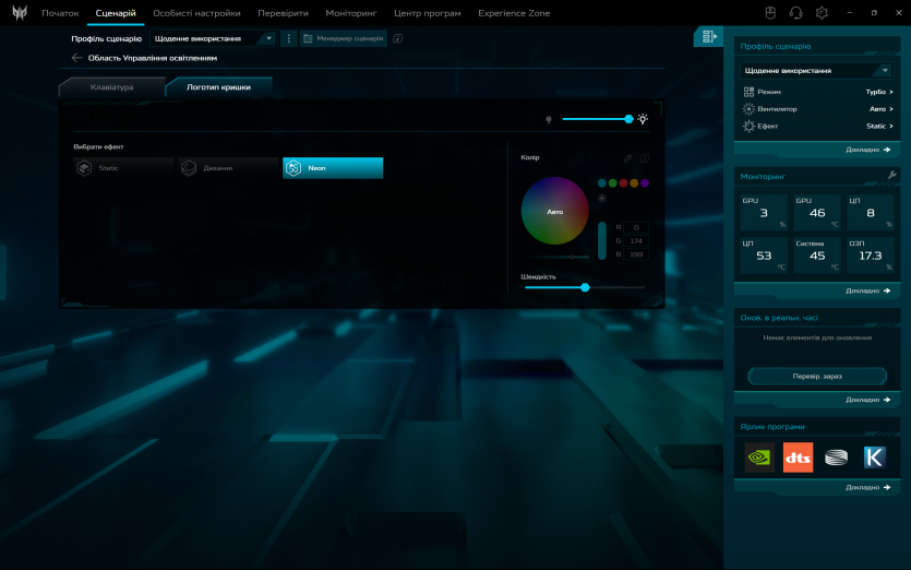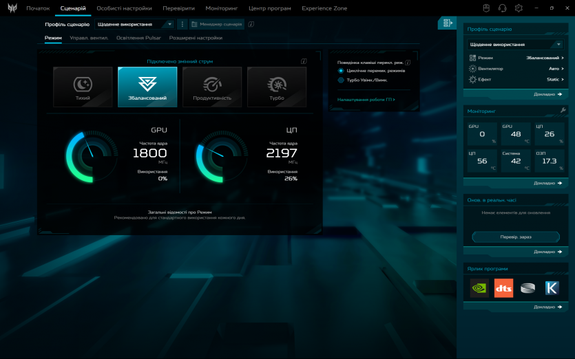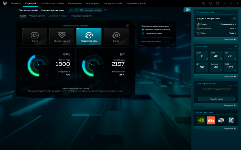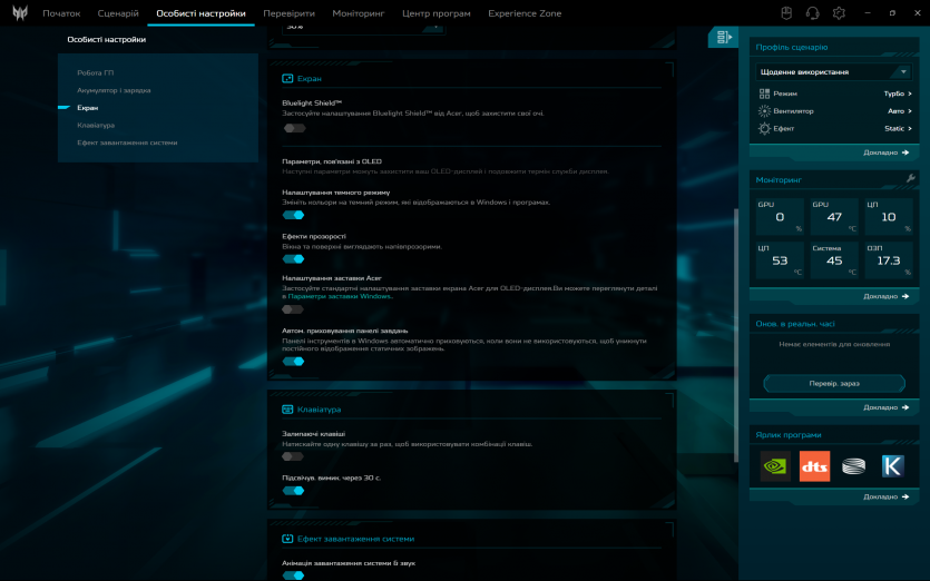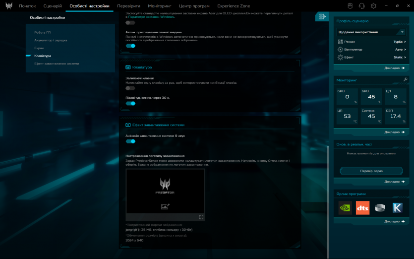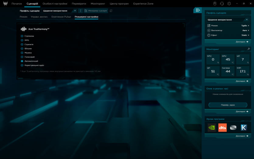 Програмна обробка звуку в Acer Predator Helios Neo 16 AI реалізована через DTS: X Ultra. Вона дозволяє змінювати профілі та створює ілюзію ширшої сцени у навушниках, але через вбудовані динаміки її ефект обмежений. Реального просторового позиціювання без гарних навушників досягти не вдається.