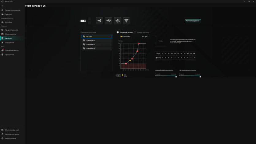 Armoury Crate — стандартна ASUS-утиліта. Вона справді корисна: крім RGB-каруселі (Aura Sync), утиліта дозволяє створювати профілі продуктивності, керувати швидкістю вентиляторів, проводити моніторинг системи та навіть оновлювати BIOS одним кліком.