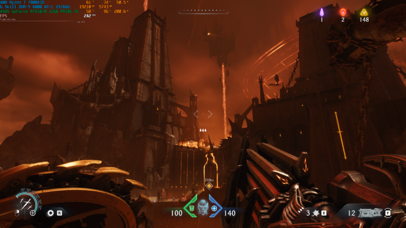 DOOM: The Dark Ages — непоганий бенчмарк для будь-якого заліза. У 1440p на максимальних налаштуваннях RTX 5070 тримає понад 67 кадрів, а з Frame Generation перевищує 200. У 4K вже складніше: рушій вимагає більше відеопам’яті, ніж доступно, і не дає використовувати FG на ультра-текстурах.