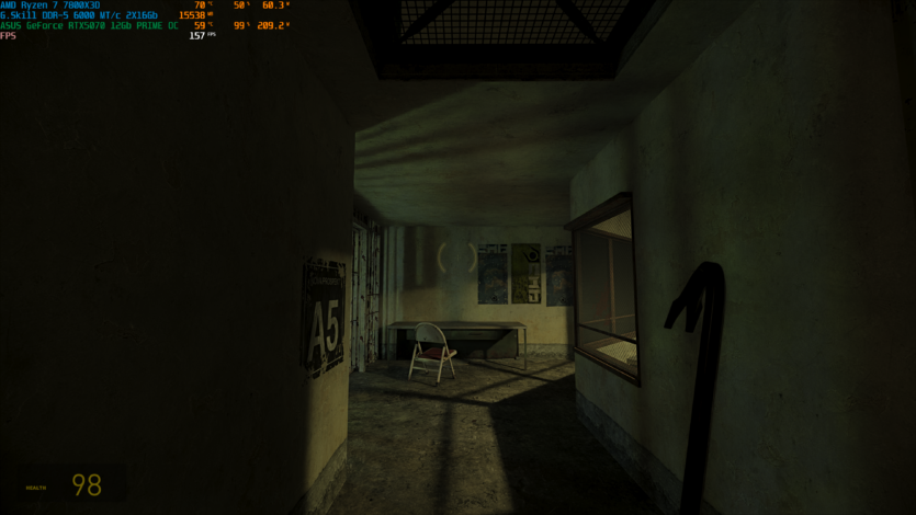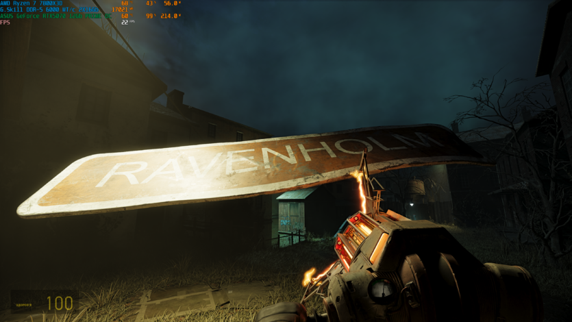 У технодемці Half-Life 2 RTX з трасуванням променів навантаження зростає. У 1440p частота кадрів приємна, але в 4K видно, як рушій вимагає всього одразу. Відеокарта тримається гідно, однак доводиться вмикати DLSS, щоб уникнути просідань. «Желейність» рухів через низькі стартові «чесні» к/с в нативі — не рятує 4-кратна генерація кадрів.
