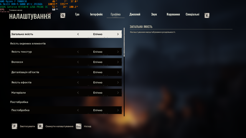 Тестування ігрових можливостей нашої збірки з AMD Ryzen 7 7800X3D та RTX 5070 ми проводили у двох роздільних здатностях — Quad HD (1440p) та Ultra HD (4K). І хоча відеокарта має 12 ГБ GDDR7, вона демонструє цілком гідну продуктивність навіть у важких сучасних тайтлах, хоча іноді доводиться трохи почаклувати, щоб уникнути обмежень по відеопам’яті.