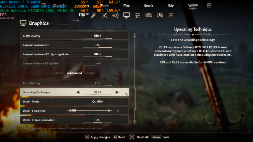 Clair Obscur: Expedition 33 вражає візуально, і система витримує цю художню навалу. У 1440p усе виглядає бездоганно, а після активації нейронного згладжування та Frame Generation fps підіймається до трицифрових значень. У 4K починаються типові труднощі, але DLSS рятує ситуацію — і гра продовжує виглядати шикарно, зберігаючи плавність.