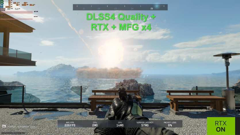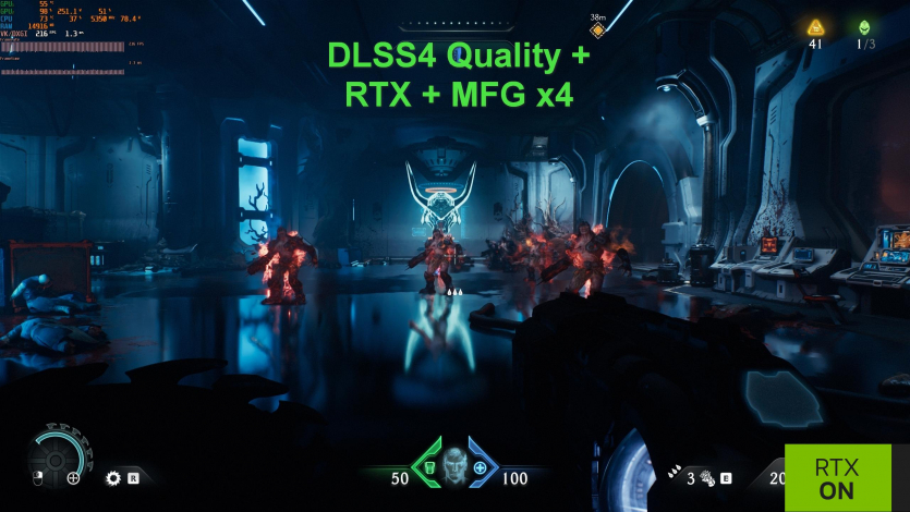- DLSS Multi Frame Generation (MFG) використовує штучний інтелект для генерації додаткових кадрів в іграх. Якщо використовувати режим “Продуктивність” (50%) в парі з MFG, то можна збільшити FPS у вісім разів порівняно з традиційним рендерингом. Таким чином гра, яка працює в класичній растеризації на умовних 40 FPS в теорії може виводити до 320 к/с. Це прийдеться до вподоби в першу чергу власникам високогерцових ігрових моніторів, щоб повністю розкрити їх потенціал.
