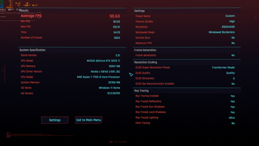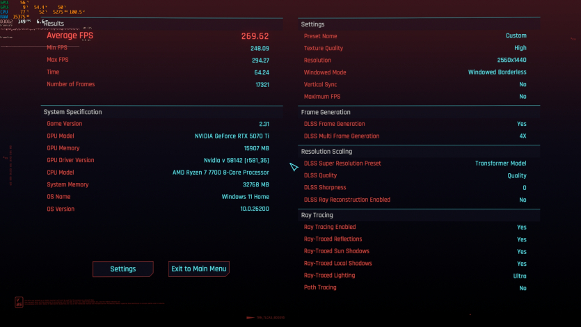 Результати тестування наочно демонструють потужність ери DLSS 4. У Cyberpunk 2077 з увімкненим Path Tracing GeForce RTX 5070 Ti видає лише 53 FPS з DLAA (у нативній роздільній здатності), але активація DLSS Quality підіймає показник до 91 к/с, а Multi Frame Generation x4 забезпечує 269 кадрів на секунду!