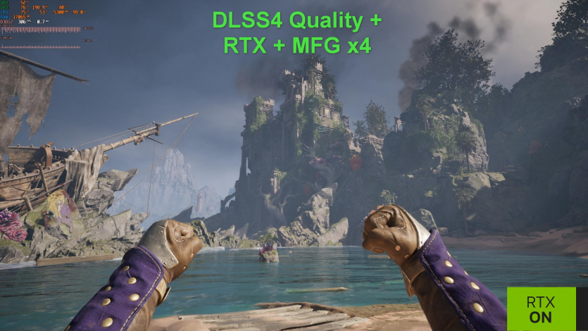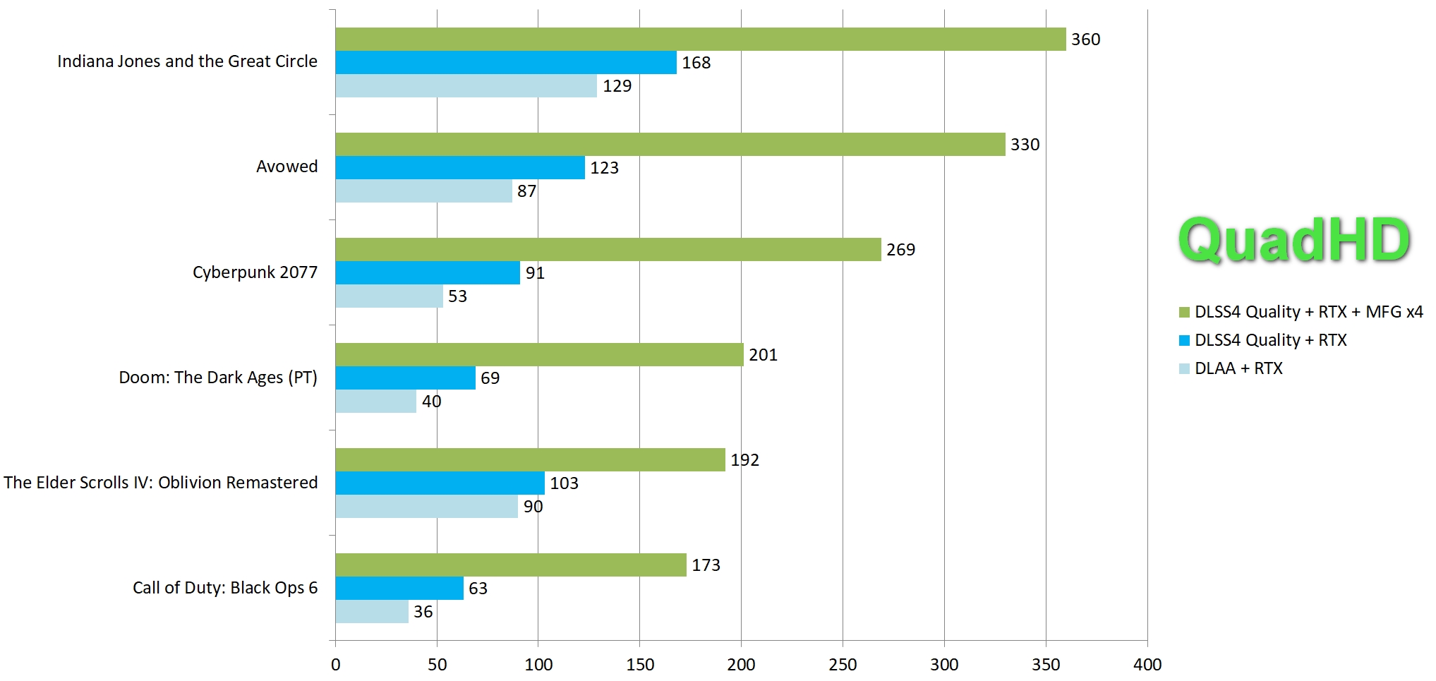 | Гра | DLAA + RTX (FPS) | DLSS4 Quality + RTX (FPS) | DLSS4 Quality + RTX + MFG x4 (FPS) |