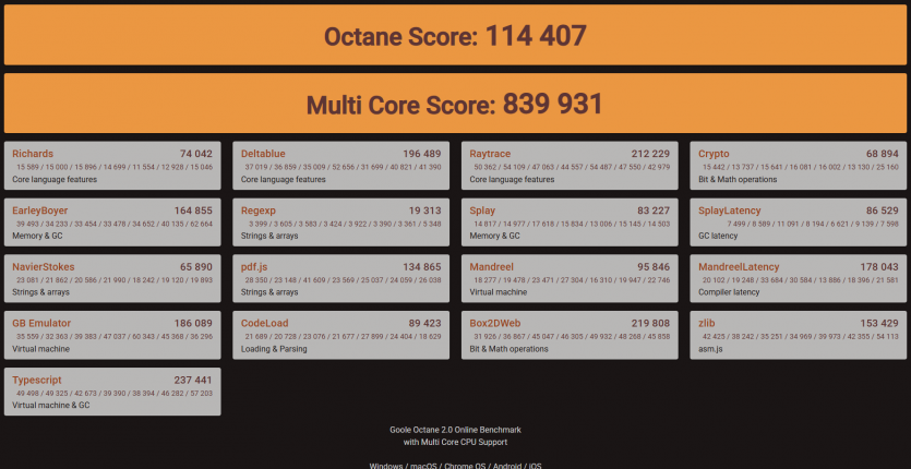 Результати браузерних тестів вселяють оптимізм. 8 ядер та 16 потоків чудово відпрацьовують набираючи 839 931 багатопотокових балів в Google Octane 2.0 Plus, а у Speedometer — 37.3