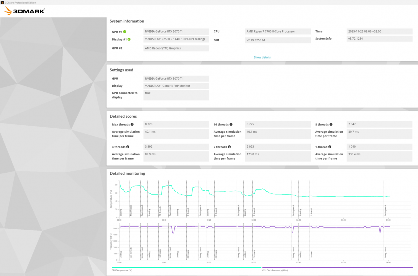 MSI GeForce RTX 5070 Ti SHADOW 3X PLUS має TGP на рівні 300 Вт. Фіксація енергоспоживання проводилась в PBO режимі “Game mode”. Система охолодження прогнозовано відпрацювала на найвищому рівні. Навіть в палких ігрових пригодах кулери розкручувались максимум на 72% від максимуму та особливо не виділялись з загального шумового фону тестової системи.