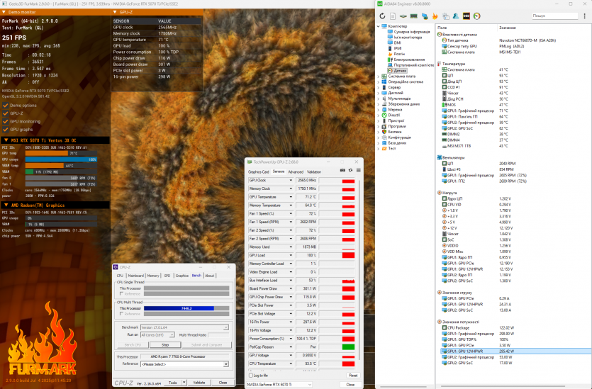 Відеокарта нагрівалась максимум до 71 градуса за Цельсієм по графічному чіпу та до 58 ℃ по пам’яті. Бекплейт та конектор були ледве теплі — 36-37 ℃. Все це завдяки системі охолодження SHADOW 3X PLUS з трьома вентиляторами.