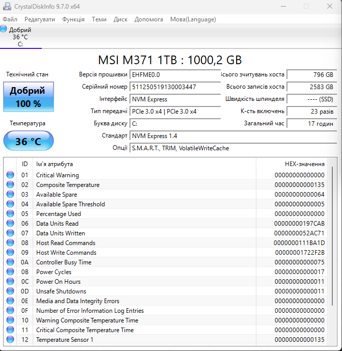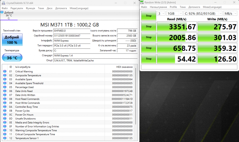 SSD MSI SPATIUM M371 ємністю 1 ТБ демонструє середню швидкість послідовного читання 3 351 МБ/с та запису 2 634 МБ/с. Система завантажувалася за 25 секунд від натиснення кнопки Power до появи робочого столу. Програми при цьому запускаються без зайвих затримок. Єдиний нюанс полягає в тому, що після заповнення місткості носія понад 70% швидкість запису “просідає”.