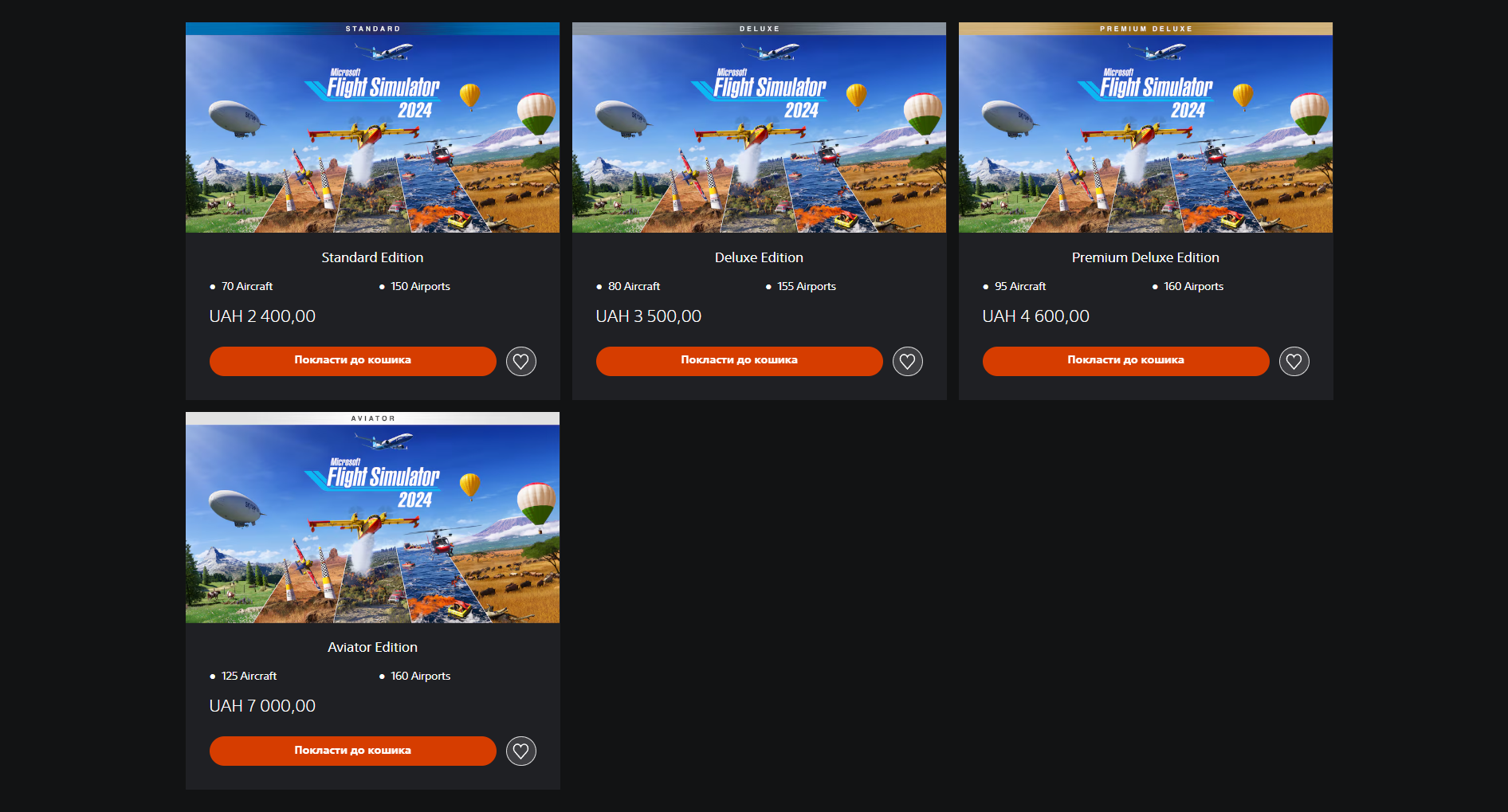 PS5-версія коштує стільки ж, скільки версії для ПК та Xbox. Але треба пам’ятати, що гра доступна в Game Pass, і недоступна в PS Plus. Стандартне видання (70 літаків, 150 створених вручну аеропортів) вартує 2 400 грн, Deluxe, яке містить 80 літаків і 155 аеропортів вже 3 500, тоді як видання Premium Deluxe (95 літаків, 160 аеропортів) обійдеться у 4 600. Найсерйозніше видання Aviator (125 літаків, 160 аеропортів) оцінюють взагалі космічно — 7 000 грн.