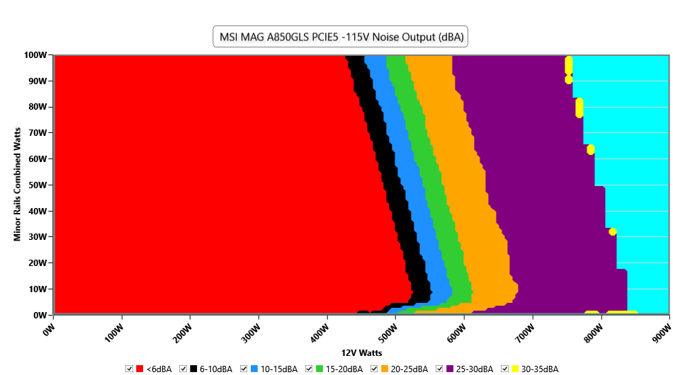 За результатами акустичних випробувань блок живлення отримав сертифікат Cybenetics A+. Шум від вентилятора зазвичай не перевищує 35 ДБа навіть при піковому навантаженні. Режим Zero Fan не передбачений.