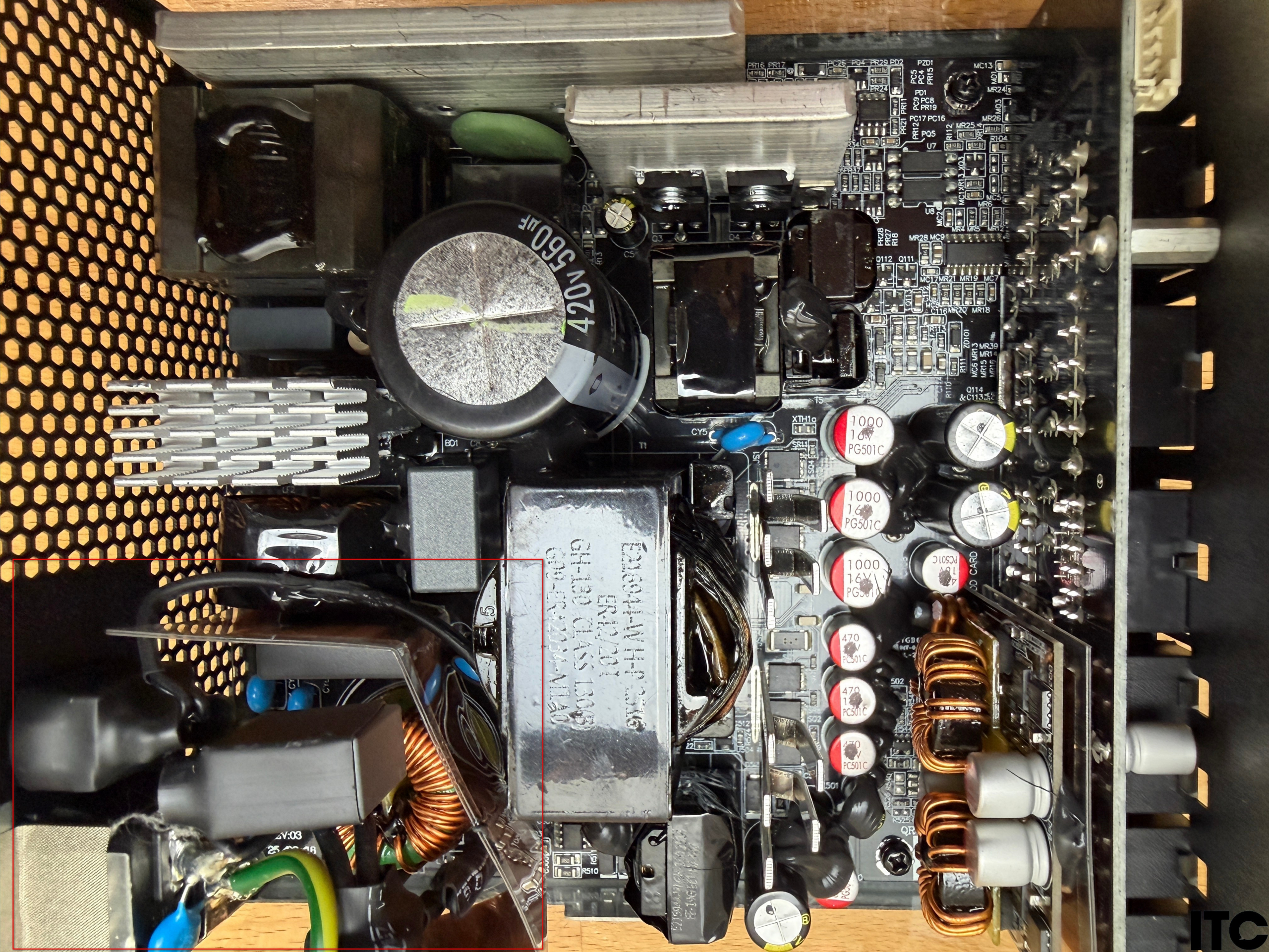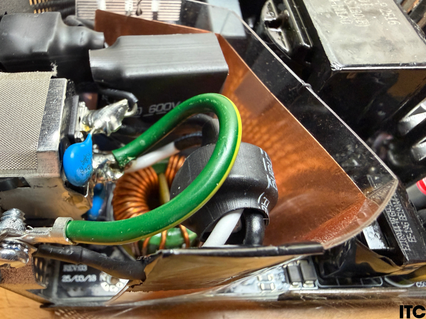 Блок живлення має повноцінний EMI-фільтр, що відокремлений від основної елементної бази за допомогою мідного екрана. Це зменшує вплив високочастотних пульсацій у вхідну мережу.