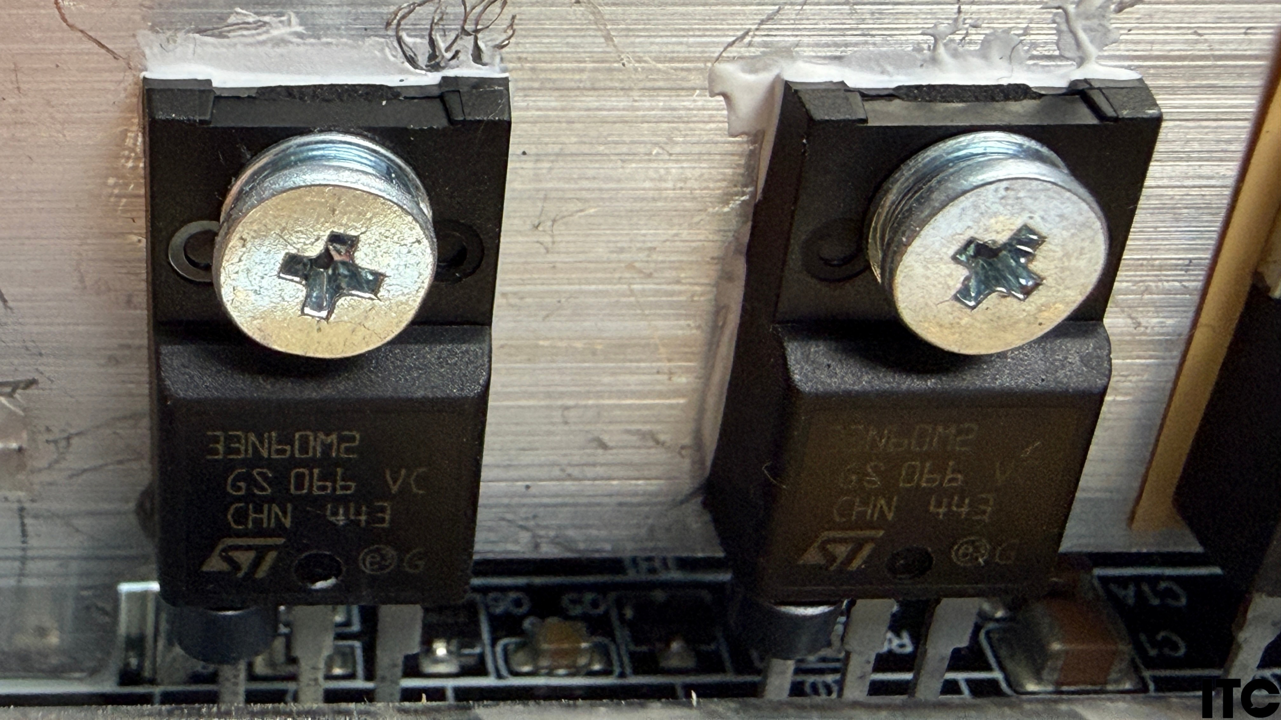 Первинний каскад на основі напівмостової LLC-топології побудований на двох MOSFET-транзисторах STF33N60M2 (650 В, 26 А, 0.125 Ом). Для них передбачений окремий радіатор.