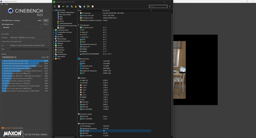 Якщо запустити типові мультипотокові тести продуктивності CPU, то ПК споживатиме від 227 Вт до 255 Вт. Додавши до цього ще й “бублик” Furmark, енергоспоживання зростає приблизно до 720 Вт.