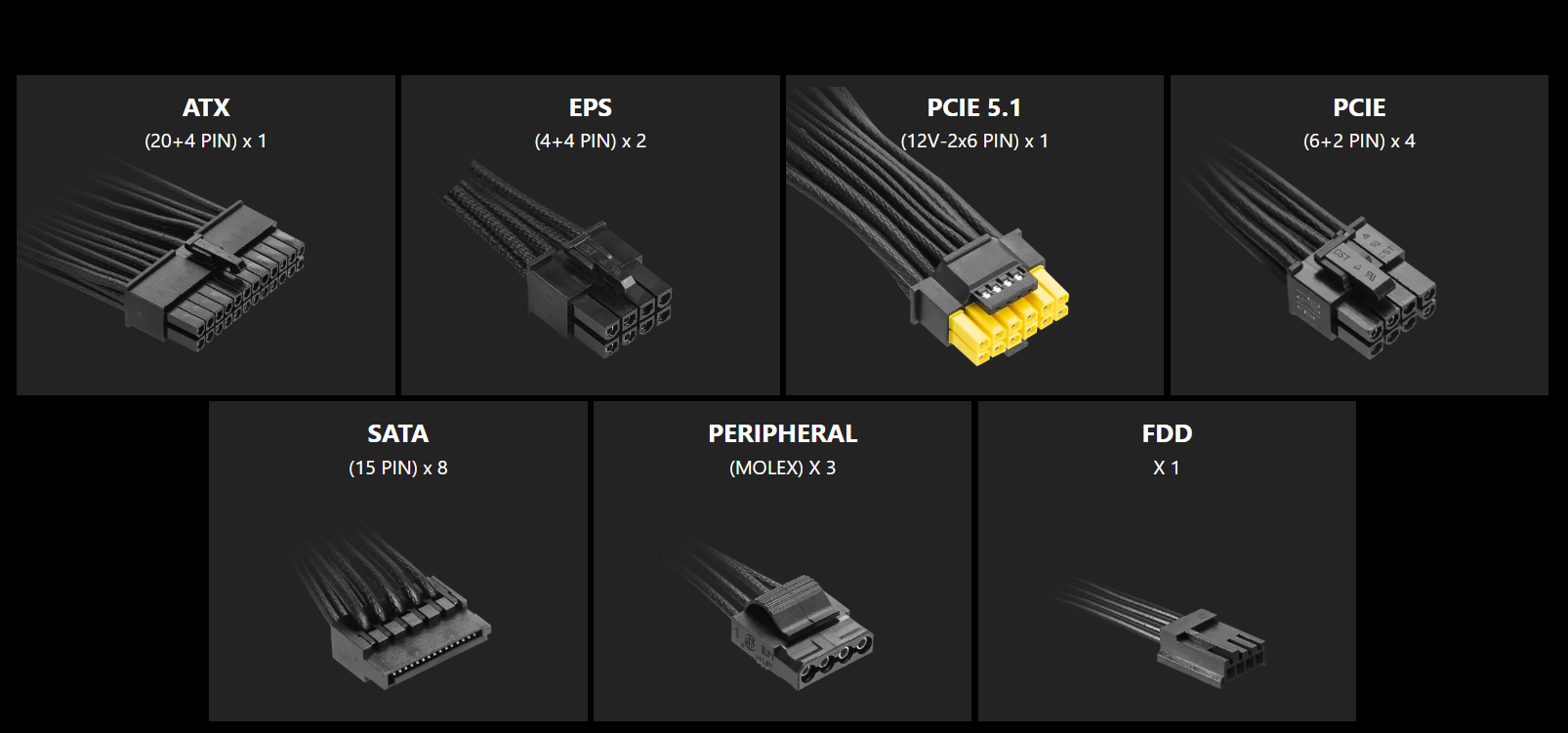 Також не забули про два сучасні PCI-E 5.1 12V-2×6, один з яких підтримує нові відекокарти NVIDIA потужністю до 600 Вт. Один 12VHPWR розгалужується на два додаткові 8 Pin (PCI-E). Для живлення периферії та накопичувачів маємо вісім SATA роз’ємів, три MOLEX і навіть архаїчний ностальгійний FDD.