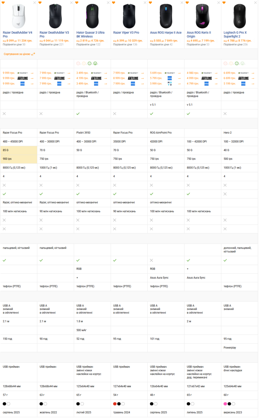 Якщо ж хочеться щось із балансом комфорту й ціни, то Asus ROG Harpe II Ace за 5555–7849 гривень або Razer Viper V3 Pro (6399–10329 гривень) виглядають розумним компромісом.