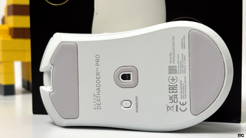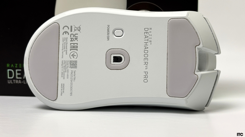 На нижній частині Razer DeathAdder V4 Pro розташовані великі глайди з 100% тефлону (PTFE), завдяки чому миша ковзає неймовірно легко навіть без килимка. У центрі — оптичний сенсор Focus Pro 45K Gen-2, оточений невеликим кільцем-глайдом, щоб рухи залишалися стабільними. Поруч розміщено кнопку для ввімкнення та перемикання профілів DPI.