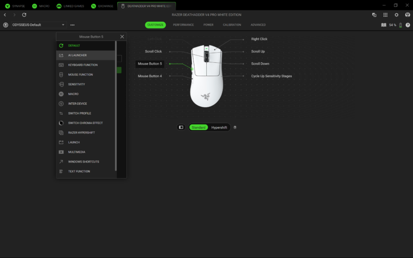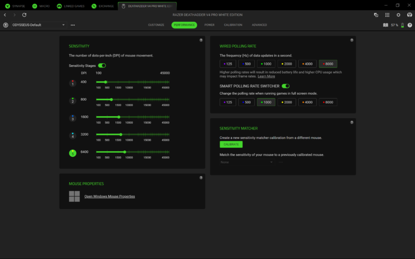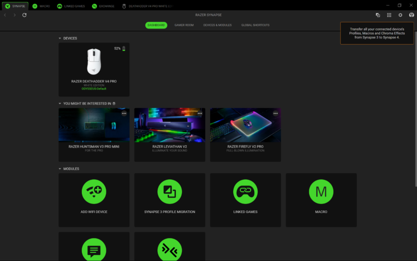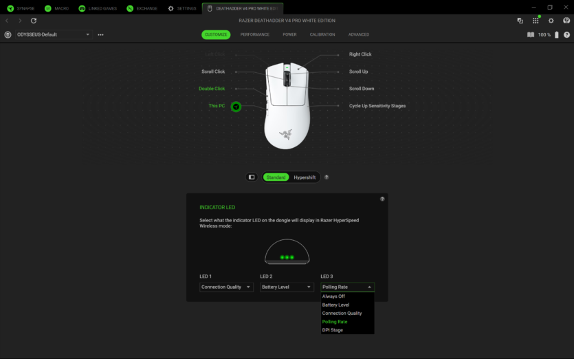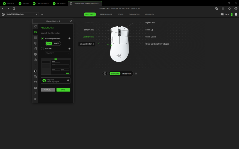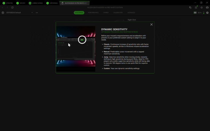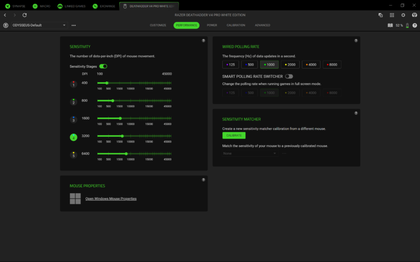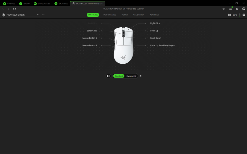 Для налаштування Razer DeathAdder V4 Pro використовується програмне забезпечення Razer Synapse 4. Воно дозволяє створювати профілі, змінювати DPI, налаштовувати частоту опитування та параметри підняття миші.